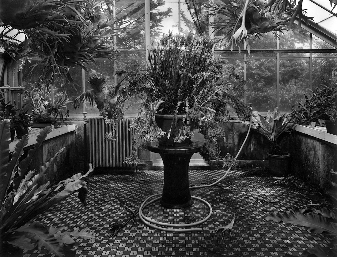 幼年期を最も身近な遊び場としての温室は幼瞳の発見の場であり、机上であり、時には傷心を癒してくれる揺籠のような存在でした。時が過ぎ再び温室に巡り逢い、着想したのは「ガラスを覗き見る、ガラスを透過する光」の概念だったのです。ガラスは視覚としての存在感は伴わず、しかし物としての確かなる存在としてのガラスは、その内側と外側の世界を完璧に分離する、そのものなのです。そして、それは、わたしの写真の永遠の仮題である、見る者への二重視覚をたちあがらせる、陰と陽、遠さと近さ、過去と未来、夢と現実、仮性と彼岸、といった両極にかけはなれているものが同時に垣間見える世界、これに共通するものなのです。