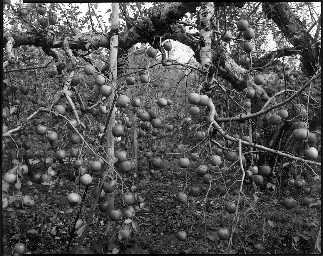 何処のりんご畑にもりんご小屋が点在しています。長年使い慣れた支えの材料、大小様々な脚立、突然の雨に使う雨合羽、お茶時に使うリンゴの空き箱、リンゴの木々の合間を行き交う数台の一輪車など、どれ一つを見ても合点がゆく物が詰まっている。そして小屋の中には六畳程の板敷きがあり、冬が早いのだろう、常時簡易の薪ストーブが設えてある。デコラ板の壁には地元のスーパーマーケットのものと思われる幾年か前のカレンダーが、隙間風に音もなく揺れている。勿論電灯は見当たらない。